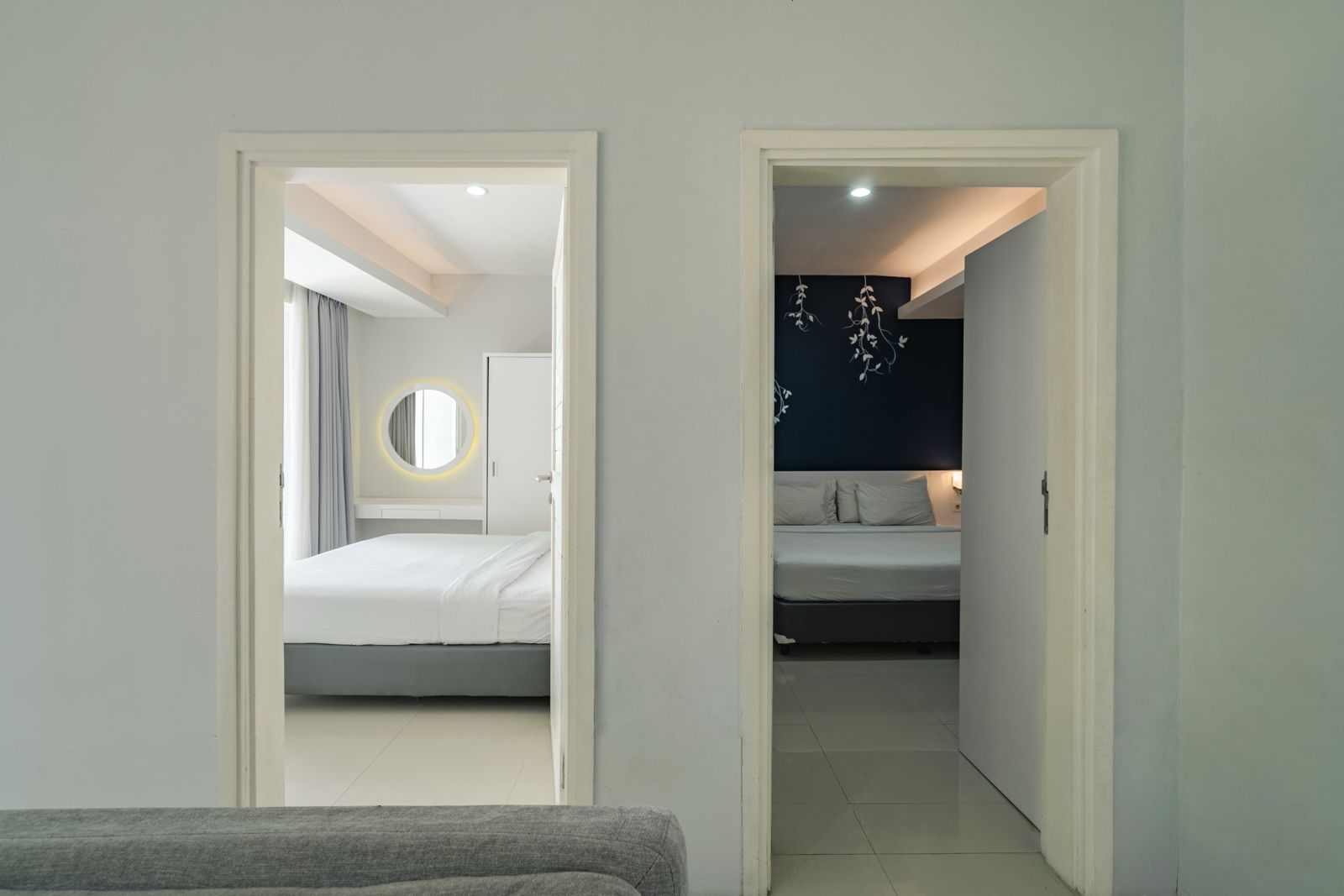 Two Bedroom offers comfort with an elegant modern design. This room is equipped with a comfortable, spacious bed, surrounded by neutral color shades and blue accents that give a lu...